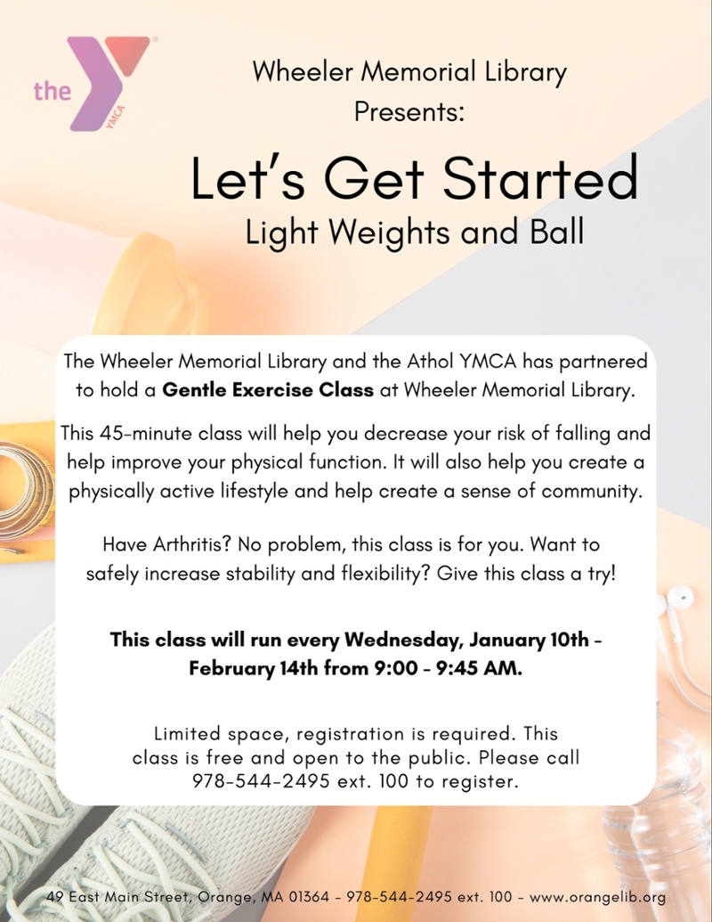 The Wheeler Memorial Library and the Athol YMCA has partnered to hold a Gentle Exercise Class at Wheeler Memorial Library. This 45-minute class will help you decrease your risk of falling and help improve your physical function. It will also help you create a physically active lifestyle and help create a sense of community.