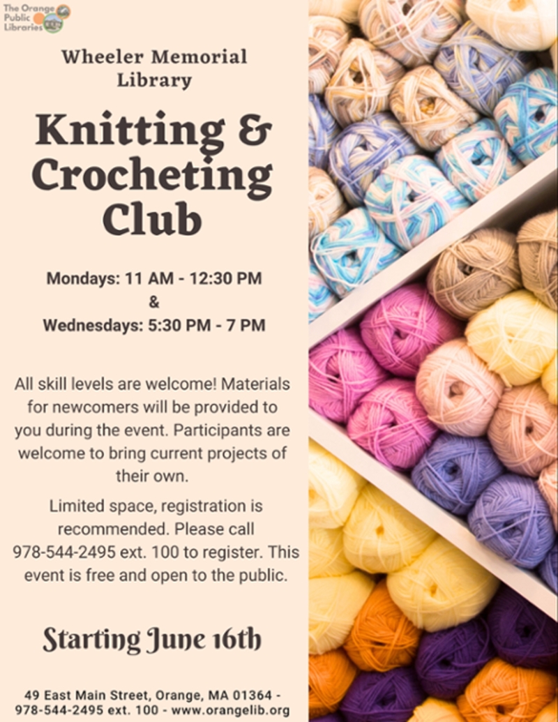 The Wheeler Memorial Library is hosting a Knitting and Crocheting Club on Mondays and Wednesdays. There are two sessions that you can attend, one on Mondays from 11:00 AM - 12:30 PM and the other on Wednesdays from 5:30 PM - 7:00 PM. All skill levels are welcome!