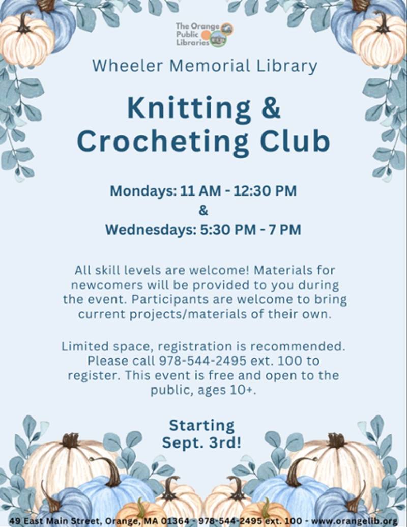 The Wheeler Memorial Library is hosting a Knitting and Crocheting Club on Mondays and Wednesdays. There are two sessions that you can attend, one on Mondays from 11:00 AM - 12:30 PM and the other on Wednesdays from 5:30 PM - 7:00 PM. All skill levels are welcome!