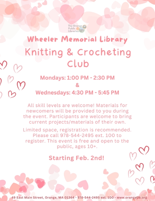 The Wheeler Memorial Library is hosting a Knitting and Crocheting Club on Mondays and Wednesdays. There are two sessions that you can attend, one on Mondays from 1:00 PM - 2:30 PM and the other on Wednesdays from 4:30 PM - 5:45 PM. All skill levels are welcome!