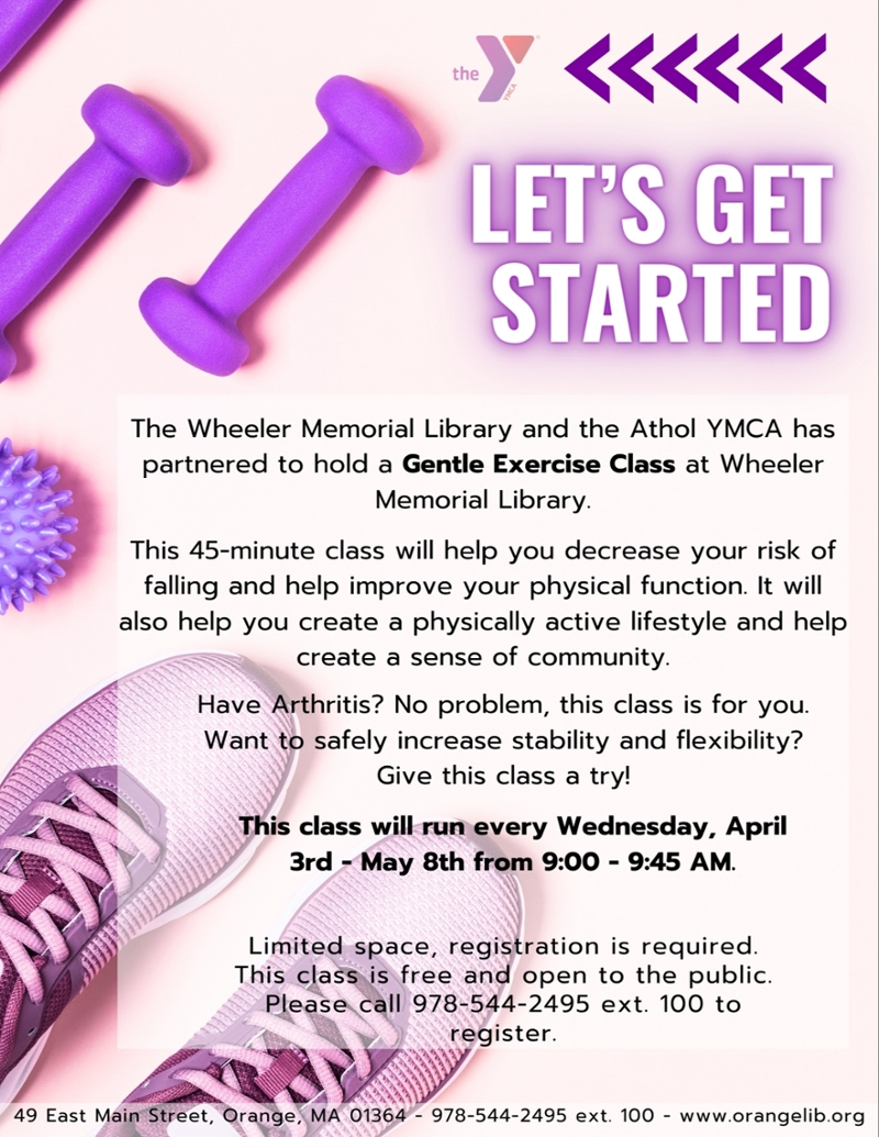 The Wheeler Memorial Library and the Athol YMCA has partnered to hold a Gentle Exercise Class at Wheeler Memorial Library. This 45-minute class will help you decrease your risk of falling and help improve your physical function. It will also help you create a physically active lifestyle and help create a sense of community.