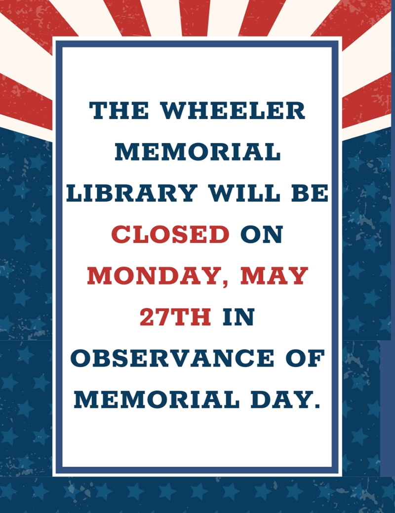 The Wheeler Memorial Library will be CLOSED on Monday, May 27th in observance of Memorial Day.