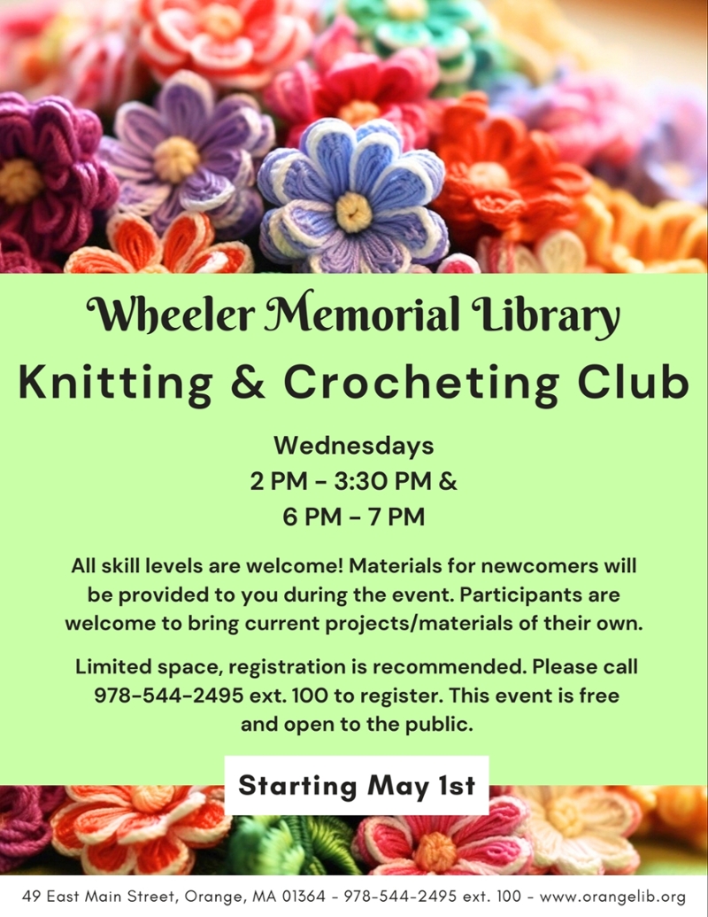The Wheeler Memorial Library is hosting a Knitting and Crocheting Club on Wednesdays. There are two sessions that you can attend, one from 2:00 - 3:30 PM and the other from 6:00 - 7:00 PM. All skill levels are welcome!