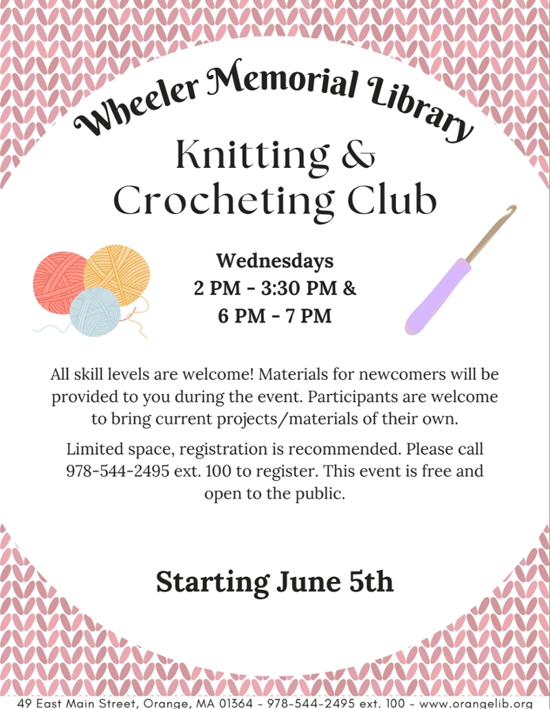 The Wheeler Memorial Library is hosting a Knitting and Crocheting Club on Wednesdays. There are two sessions that you can attend, one from 2:00 - 3:30 PM and the other from 6:00 - 7:00 PM. All skill levels are welcome!