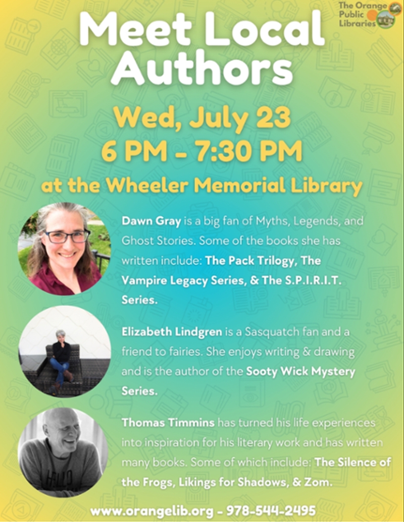 Local Authors Dawn Gray, Elizabeth Lindgren, & Thomas Timmins will be answering questions, reading aloud, signing books & more at the Wheeler Memorial Library!