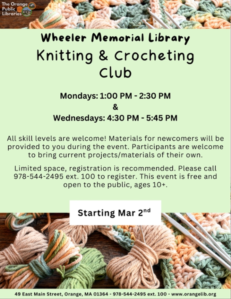 The Wheeler Memorial Library is hosting a Knitting and Crocheting Club on Mondays and Wednesdays. There are two sessions that you can attend, one on Mondays from 1:00 PM - 2:30 PM and the other on Wednesdays from 4:30 PM - 5:45 PM. All skill levels are welcome!